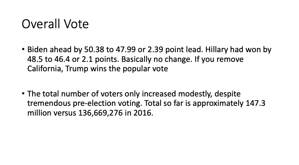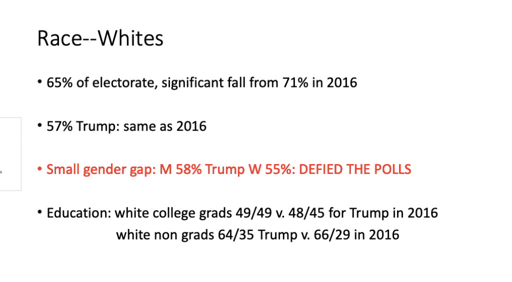 2. Virtually all pre-election polls and surveys predicted that large numbers of white women, white suburbanites and white retirees would desert Trump and give the Democrats a big victory. Instead, the white electorate voted for Trump in the same percentages as 2016 (57%).