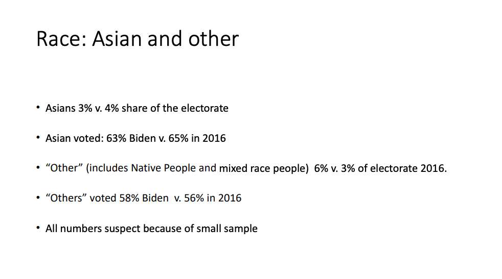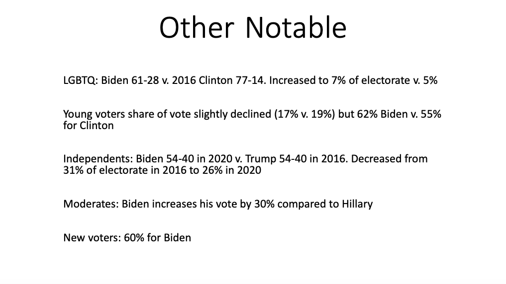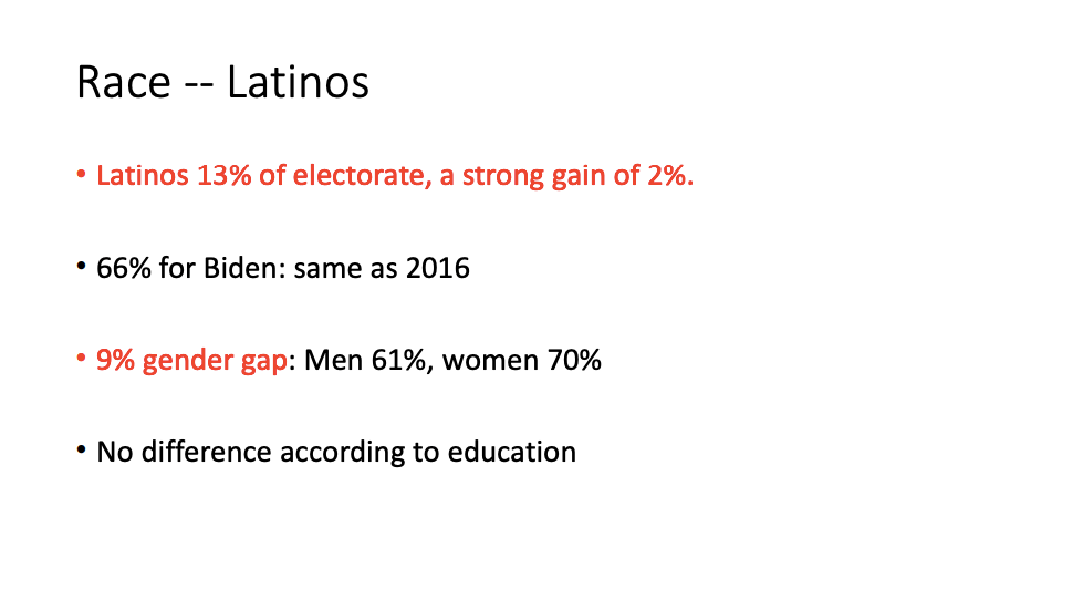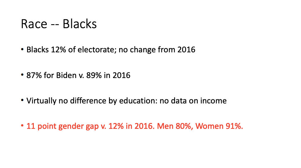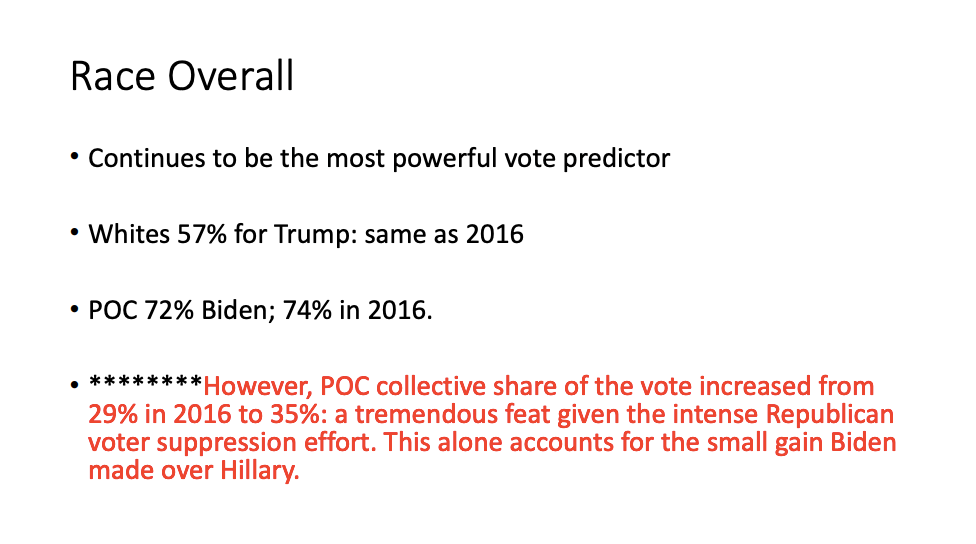 1. Despite Trump’s outrageous voter suppression campaign and the still raging Covid-19 crisis, people of color voters bravely turned out in unprecedented numbers, raising their share of the electorate from 29% to 35%. Defying the media and pollster drumbeat that many would turn to Trump, they voted 72% for Biden, virtually the same as their vote for Clinton. Latinos increased their share of the vote from 9% to 11%. Voters of color were the key to Biden’s victory.