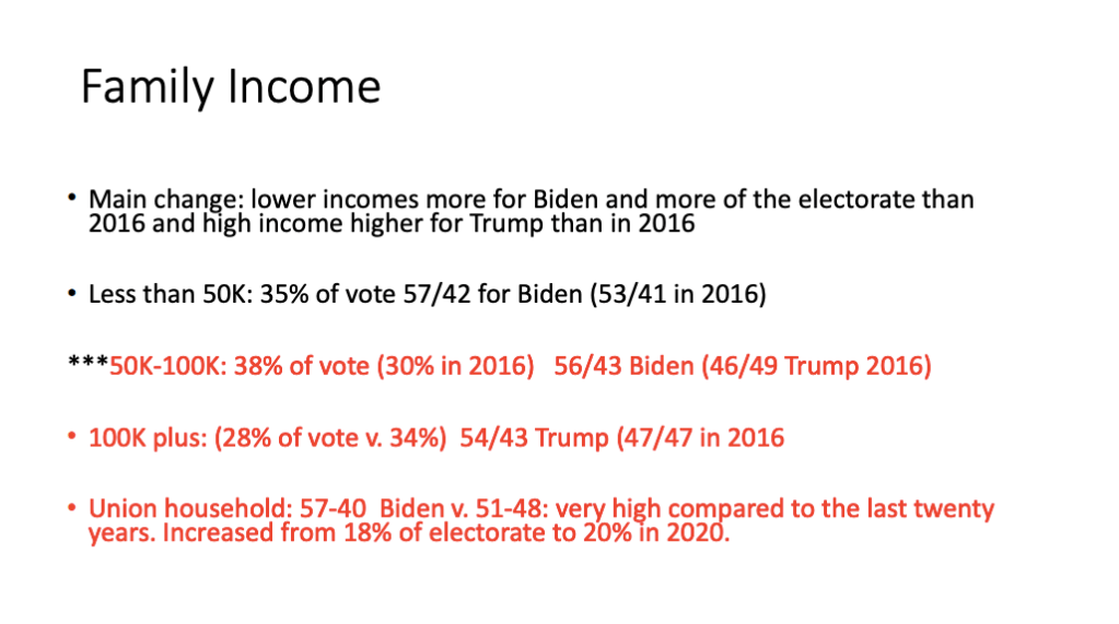 4. Lower and moderate income voters went more strongly for the Democrats than in 2016. Voters from families making less than $50,000 per year went for Biden 57% compared to Clinton 53%. Voters from families making $50-100,000 increased their share of the electorate (38% v. 30%) and this time went for Biden by 56% rather than Trump (49% in 2016).