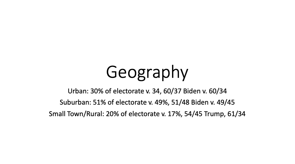 5. Voters from families making more than $100,000 were less of the electorate (28% v. 34% in 2016) and voted more heavily for Trump this time (54% v. 47% in 2016).